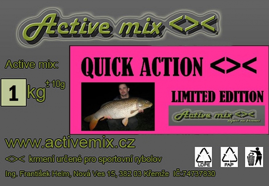 Tento víkend (2.8.2013 - 4.8.2013) pro Vás vypisuji na prvního chyceného kapra nad 80 cm prémii - dvou kilové balení Quick Action od Active mixu zdarma (není ještě ani v prodeji - prodej od 5.8.2013). Úlovek je nutno nahlásit a zdokumentovat.